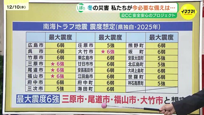 広島県が公表している南海トラフ地震の想定震度です。三原市・尾道市・福山市・大竹市で「最大震度6強」と想定されています。南東部の広い範囲で震度5強以上の揺れが見込まれています。
