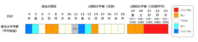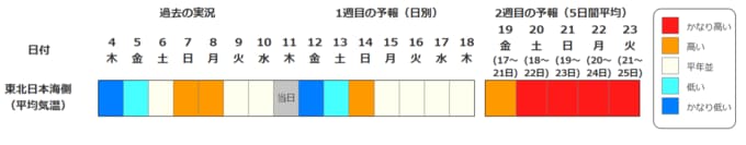 東北地方の気温は、向こう2日間程度は寒気の影響で低いですが、その後は、寒気の影響を受けにくいため平年並か高く、18日頃からはかなり高くなる見込みです。