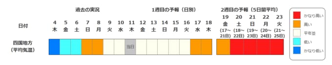 四国地方の気温は、向こう2日間程度は寒気の影響で平年並か低いですが、その後は寒気の影響を受けにくいため平年並か高く、18日頃からはかなり高くなる可能性があります。