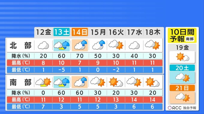 週末は再び天気が崩れ、土曜日の午後から日曜日の朝にかけて雨や雪が降る見込みです。気温も低く、かなり寒く感じられるでしょう。特に土曜日朝の冷え込みはかなり強まりますのでご注意ください。