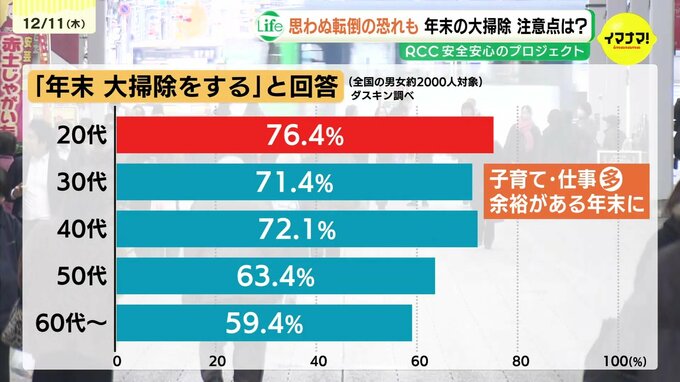 大手清掃会社「ダスキン」が、全国の約2000人に行ったインターネット調査によると「大掃除をする予定」と答えた人は、20代が最も多い結果でした。子育てや仕事で忙しく、年末にまとめてキレイにしたいという傾向がありそうです。