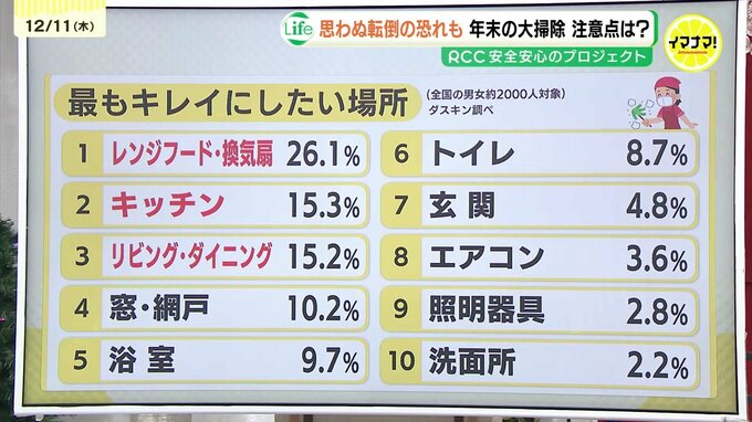 大掃除は、普段なかなか手が回らない場所を重点的に行う傾向があります。皆さんがどこを重点的に掃除しているのか、ダスキンの調査を基にしたランキングをご紹介します。