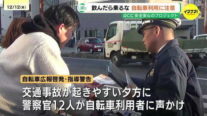 10日に広島市中心部の交差点で行われた啓発活動には、交通事故が起きやすい日暮れと帰宅ラッシュの時間帯が重なる夕方にあわせて、警察官12人が自転車の利用者に声をかけていました。