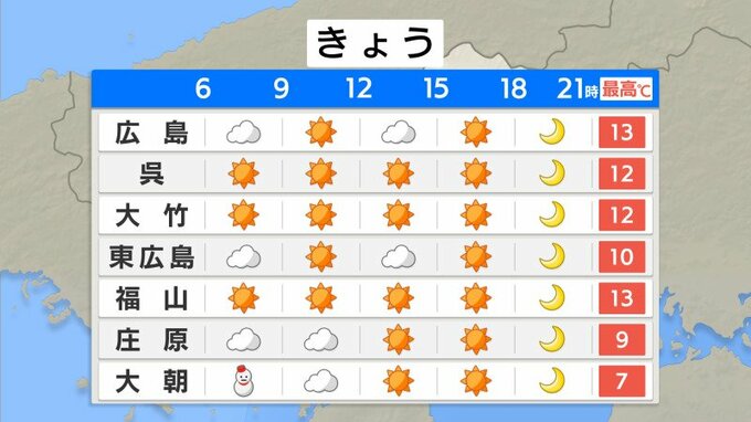 広島市中区3.1℃・庄原市-2.1℃・世羅町-2.2℃で各地で強い冷え込みとなりました。