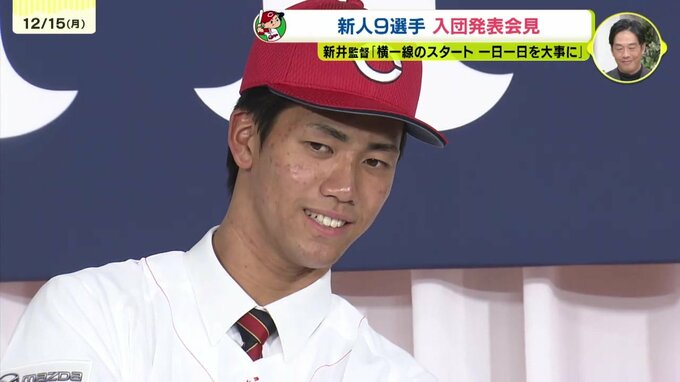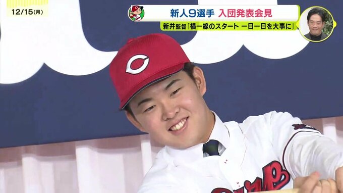 「高校生がひとりということで不安も緊張もあったが、きのうも先輩方に挨拶したときに笑顔で優しく話しかけてくれたのでこういうすばらしい先輩と同期入団できたのは誇りに思う。背番号が54ということで小園海斗さんの5番と矢野雅哉さんの4番があるので将来的には2人の素晴らしいところを足したような選手になっていきたい。」