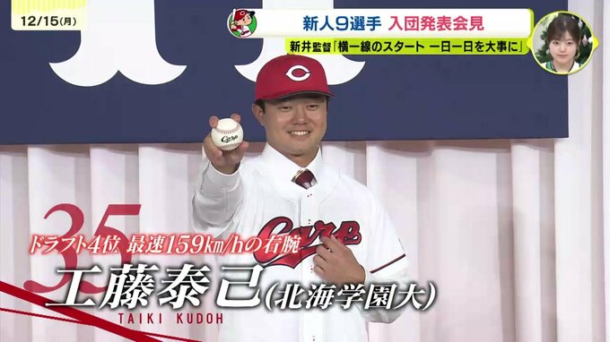 ドラフト4位は北海学園大学の工藤泰己。直球は最速159kmを誇りカープの日本人選手では初となる160kmへの到達、またリリーフ陣の核となることを誓いました。