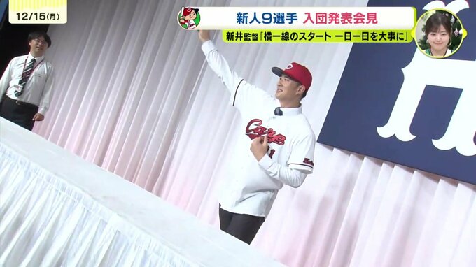 かつて鈴木誠也、小園海斗がつけた背番号51を受け継ぎルーキーイヤーからの活躍を誓いました。