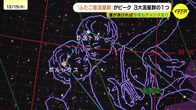 「ふたご座のポルックス・カストルという星。ポルックスは弟・カストルは兄。カストルの近くから放射状に流れるように見えることから『ふたご座流星群』という名前がついた」