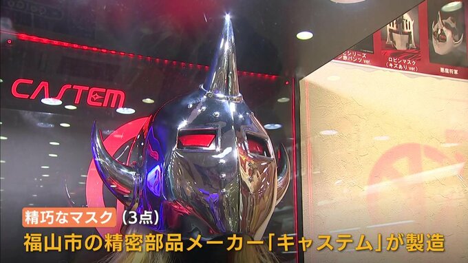 3点のマスクは、福山市の精密部品メーカー「キャステム」が手がけたもので、受注生産で販売しています。人気の正義超人「ロビンマスク」…。その精巧さはファン必見です。