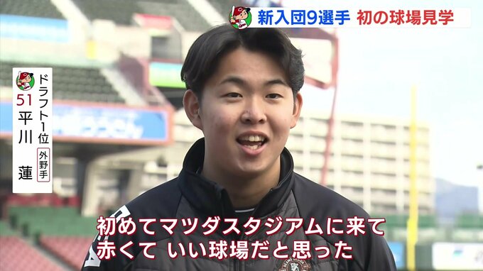 入団会見から一夜、9人のルーキーがマツダスタジアムのグラウンドに初めて足を踏み入れました。
