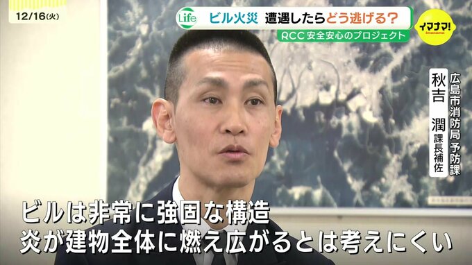 「ビルというのは非常に強固な構造になっているので、基本的に炎が建物全体に燃え広がるということは考えにくい。やはり一番逃げないといけない対象、危険となる対象というのは煙なので、この煙に巻き込まれないように逃げるというのが基本になってくるのかなと思う」