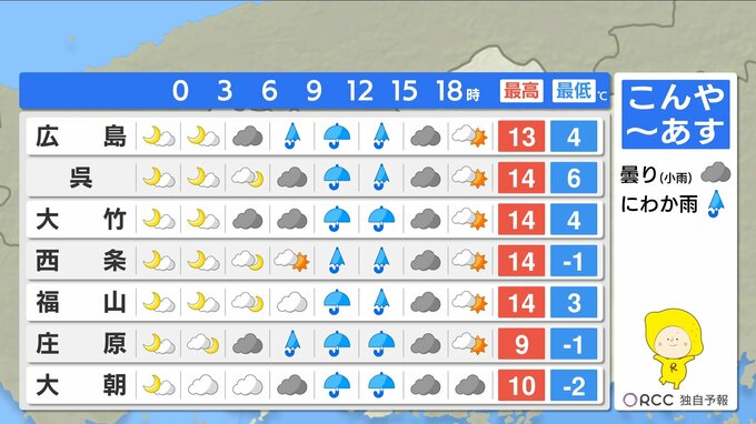 【あす12/17(水)広島天気 】早ければ朝から 広く一時的に雨 朝は傘を忘れずに 2025年12月16日(火) 19:48 国内 天気 日中の気温はきょうより高く あす朝の冷え込みは緩み、日中の気温はきょうよりやや高くなる見込みです。ただ、雨が降るため気温よりも寒さを感じそうです。暖かくしてお過ごしください。