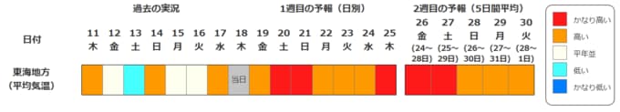 東海地方の向こう2週間の気温は、寒気の影響が弱く、暖かい空気が流れ込む日もあるため高く、かなり高い日も多い見込みです。