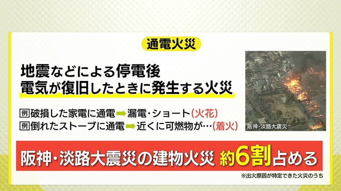地震などによる停電後、電気が復旧したときに発生する火災です。