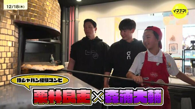 まずは、侍ジャパンで世界を相手に戦った栗林と森浦。世界一のピザ少年と初めてピザ作りに挑戦。