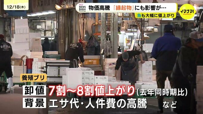 ブリは、鹿児島県産の養殖物が中心ですが、卸値は去年の同時期と比べ、1.7倍~1.8倍に値上がりしています。背景には、エサ代や人件費の高騰などが影響しているそうです。