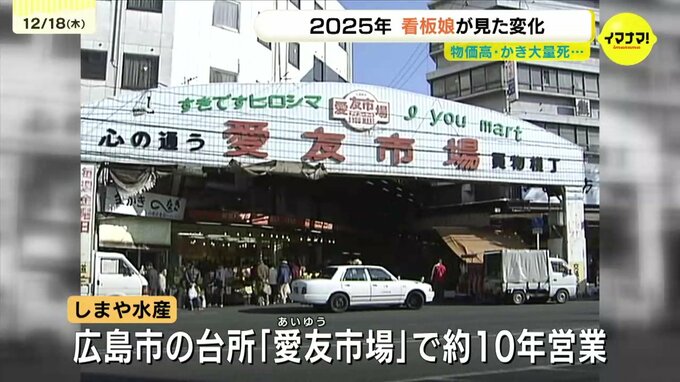 しまや水産はかつて、広島市の台所として栄えたJR広島駅南口の愛友市場にありました。年の瀬には、旬の魚介類がところせましと並び、大勢の人でにぎわっていました。