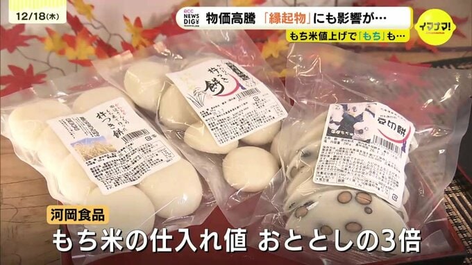 広島市安佐南区の和菓子店「河岡食品」です。県産のもち米を使った商品などが並びますが、仕入れ値が、おととしに比べ3倍に。もちの販売価格は光熱費・人件費の高騰も重なり、最大1.6倍ほどに値上がりしています。