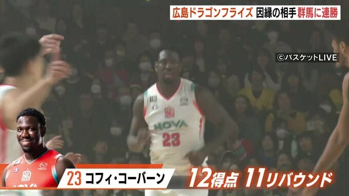 広島ドラゴンフライズは東地区4位で因縁の相手、群馬クレインサンダーズとアウェイで対戦し、連勝を決めました。