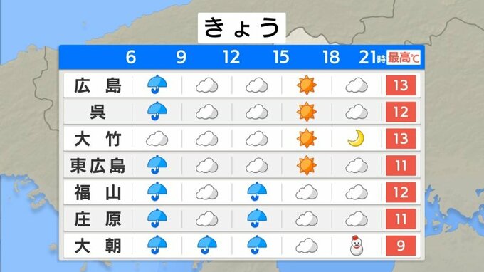 きょう25日(木)の広島県内の朝は、広く雨が降っています。上空には、暖かい空気が入っているため、朝の冷え込みは弱く、最低気温は広島10.4℃、三次・庄原8.2℃でした。