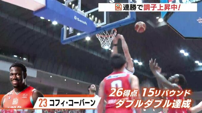 コーバーンはその後もリバウンドからの得点など26得点15リバウンドのダブルダブルを達成しチームを引っ張ります。