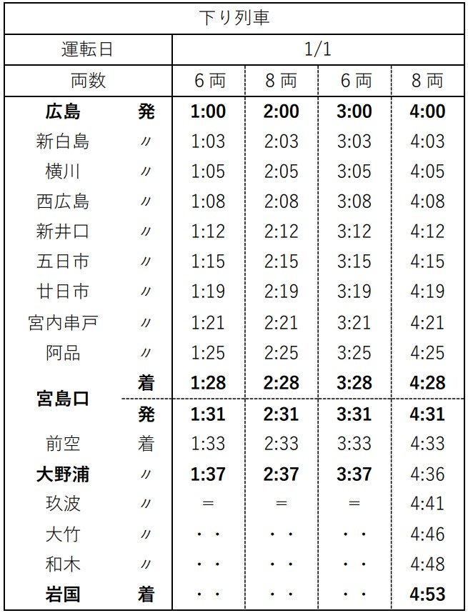 上りも、岩国駅や大野浦駅が始発で、宮島口駅を午前1時18分に出る広島駅行きの臨時列車から、1時間おきに4本を運行します。