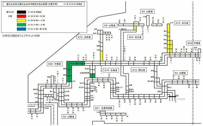 NEXCO西日本と国土交通省中国地方整備局は、2日から3日にかけて西日本の広範囲で降雪が予想されることから、高速道路の一部区間で「予防的通行止め」を実施する可能性があると発表しています。