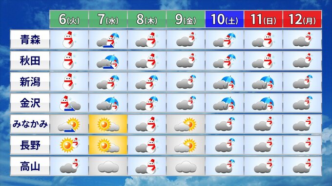 気象庁は5日、「大雪に関する早期天候情報」を発表しました。12日頃から、東北・北陸・関東甲信・東海地方の日本海側で、この時期としては降雪量が「かなり多い」可能性があるとしています。12日頃からは一時的に、冬型の気圧配置が強まる予想です。交通障害や除雪などの対応に留意するとともに、農作物の管理に注意してください。