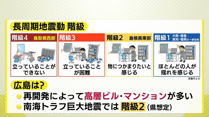長周期地震動の「階級」は、長周期地震動による揺れの大きさを示すもので、「震度」とは異なります。階級は1~4に分かれていて、「階級4」では立っていることができない状態です。6日午前10時18分に発生した地震では、鳥取県西部で「階級4」が観測されました。(※「階級4」の観測は鳥取県では初。全国では2024年1月の能登半島地震以来)