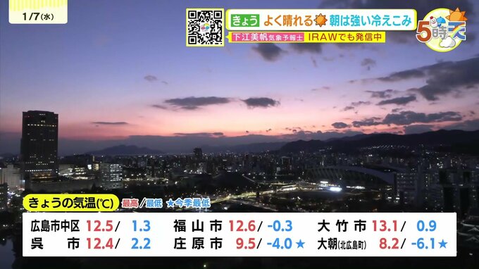 けさは冷え込みが強まり、大朝や庄原では今季一番の冷え込みになりました。広島市中区でも1.3℃まで冷え込んでいます。