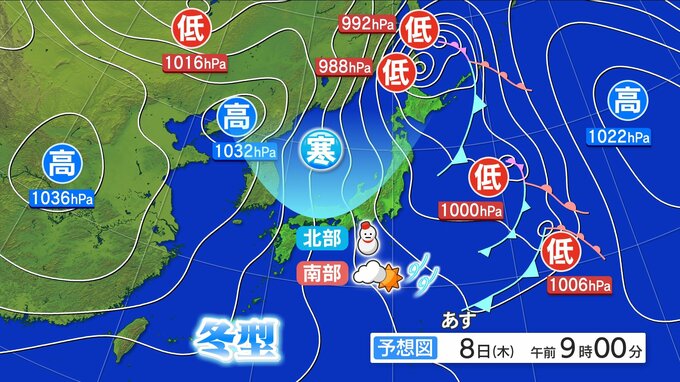 1月8日(木)強い寒気流入 南部晴れ間 北部は雪 気温大幅ダウン