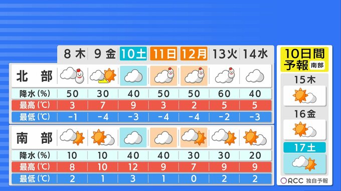 昨日の地震で地盤が緩んでいる箇所がある可能性もありますので、3連休の天気は最新の情報を確認していただき、車の運転はくれぐれも慎重にお願いします。日中の気温は沿岸部で10℃を下回る日が多く、厳しい寒さがつづくでしょう。