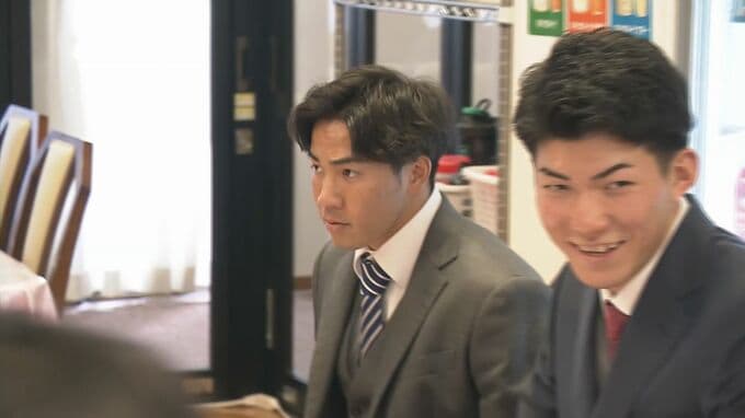 育成1位の小林結太選手(城西大)は、地元のスポーツ店から記念に贈られたバットと共に「クレヨンしんちゃん」に登場するボーちゃんのティッシュケースを持参。