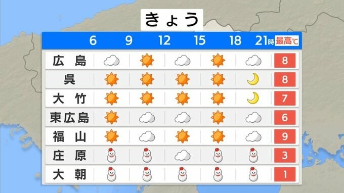 きょう8日(木)の広島県内の朝は、北部で雪が降っています。各地で雲がかかっているため、放射冷却は効きにくく、朝の冷え込みはきのうよりもゆるんでいます。最低気温は、広島4.9℃、三次0.9℃でした。