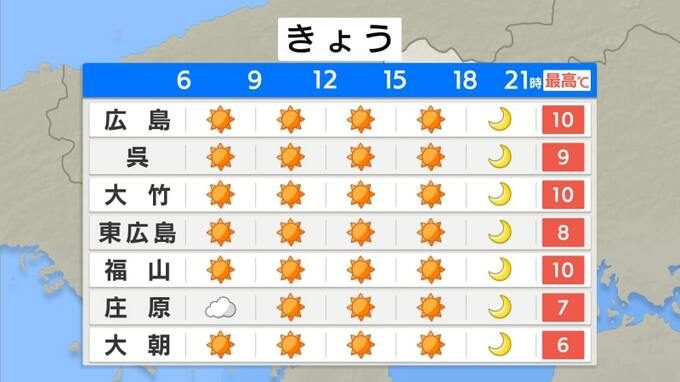 この後も引き続きよく晴れて冬晴れの空が広がるでしょう。空気が非常に乾燥しますので、火の取り扱いにはご注意ください。最高気温は、沿岸部で9℃~10℃くらい 北部では5℃前後の地点が多いでしょう。庄原7℃の予想です。きのうと比べると高くなりますが、引き続き厳しい寒さになります。防寒対策をしっかりしてお過ごしください。