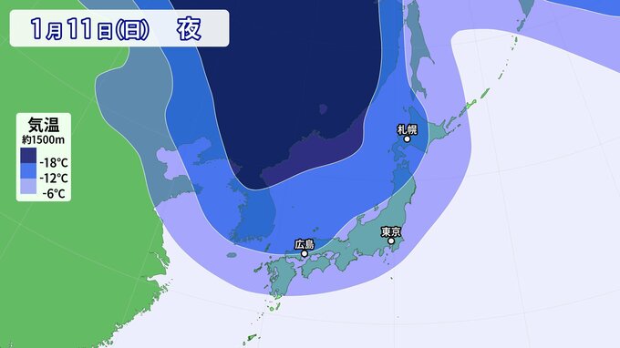 上空1500m付近の寒気の予想を見てみると、11日(日)夜、平地で雪を降らせる目安の-6℃以下の寒気が日本の南岸までかかっています。中国地方などでは、大雪になるレベルの-12℃以下の寒気が入る見込みです。