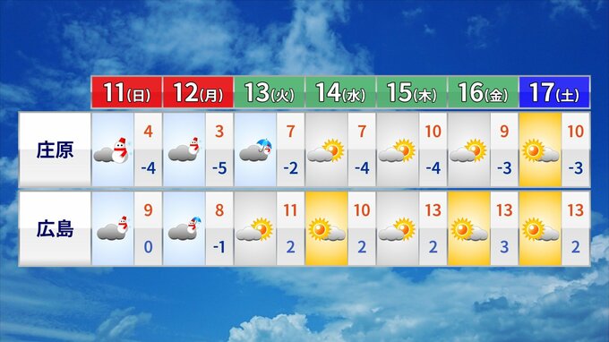 3連休は県内も強い寒気が流れ込み、強烈寒波が到来する見込みです。大雪に注意が必要となり、積雪や路面凍結による交通障害などに十分注意が必要です。その後来週火曜日以降は、南部では晴れ間が広がる予想です。