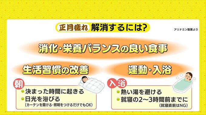 また、適度な運動や入浴も行いましょう。入浴の際は熱いお湯を避け、就寝の2時間から3時間前には済ませることが推奨されています。就寝の直前だと寝付きが悪くなってしまうためです。消化、栄養バランスの良い食事も心がけましょう。(アリナミン製薬より)