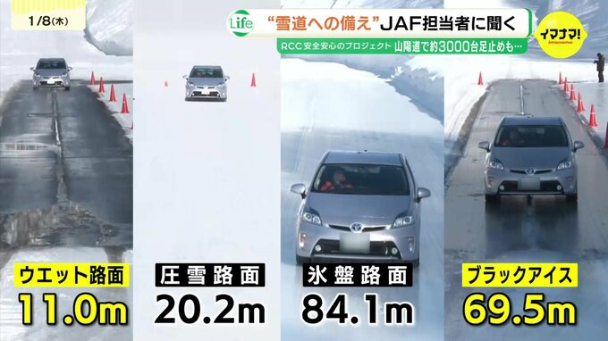 JAFの実験データによると、時速40kmで急ブレーキをかけた際、濡れた路面での制動距離はおよそ10m。しかし、路面が凍っているブラックアイスバーンでは70mもの距離を滑ってしまいます。