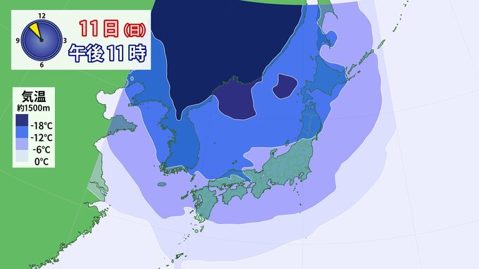 上空1500m付近の寒気の予想を見てみると、11日(日)夜、平地で雪を降らせる目安の-6℃以下の寒気が日本の南岸まで覆っています。広島では、さらに強いレベルの-12℃以下の寒気がかかる見込みです。また、上空のより高い位置の寒気を見ると、北日本には大雪を降らせる目安の非常に強い寒気が入る見通しです。