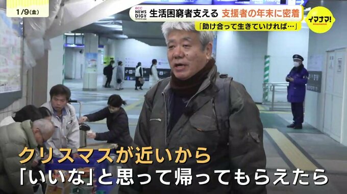 クリスマスが近いこの日(12月23日)は、「少しでも気持ちが明るくなって帰ってもらえたら」という思いで、集まったおよそ30人に丁寧に声をかけながらおにぎりやお菓子を配りました。