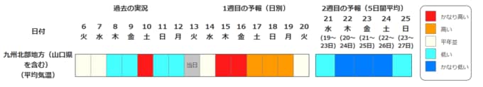 九州北部地方(山口県を含む)の気温は、向こう6日間程度は寒気の影響を受けにくいため高い日が多いですが、その後は冬型の気圧配置が強まる時期があり、寒気の影響を受けやすいため低い日が多く、20日頃からはかなり低くなる可能性があります。