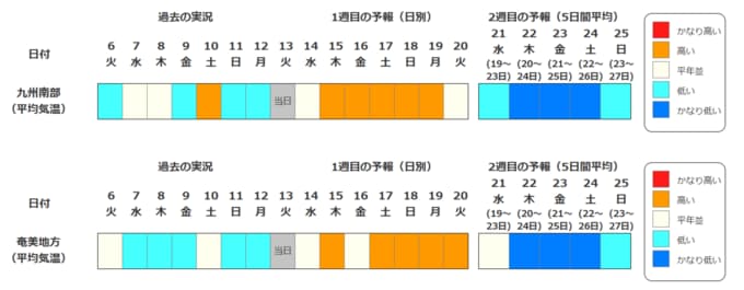 九州南部・奄美地方の気温は、向こう1週間程度は寒気の影響を受けにくいため高い日が多いですが、その後は冬型の気圧配置が強まる時期があり、寒気の影響を受けやすいため低い日が多く、21日頃からはかなり低くなる可能性があります。