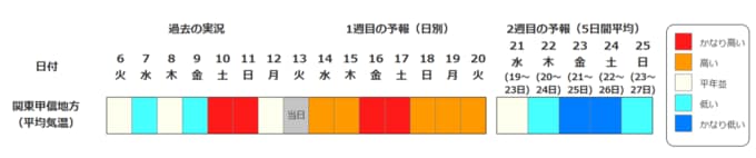 関東甲信地方の気温は、向こう1週間程度は寒気の影響を受けにくいため高いですが、その後は冬型の気圧配置が強まる時期があり、寒気の影響を受けやすいため低い日が多く、21日頃からはかなり低くなる可能性があります。また、21日頃からは長野県北部・群馬県北部を中心に降雪量がかなり多くなる可能性があります。