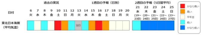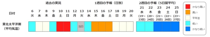 東北地方の気温は、向こう6日間程度は寒気の影響を受けにくいため平年並か高い日が多いですが、その後は冬型の気圧配置が強まる時期があり、寒気の影響を受けやすいため低い日が多く、20日頃からはかなり低くなる可能性があります。また、20日頃からは東北日本海側を中心に降雪量がかなり多くなる可能性があります。