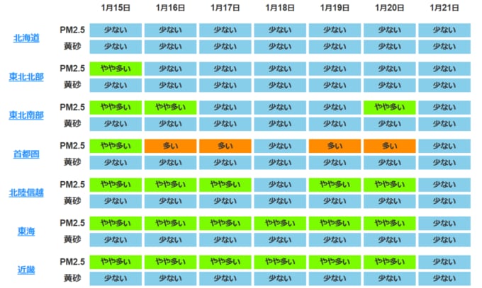 SPRINTARSによると20日頃にかけて日本列島でPM2.5もやや多い、多いところがある予想です。目・鼻・皮膚などにアレルギーがある人や喘息など呼吸器に疾患がある人は体調管理に十分注意してください。また、2月になると、だんだんと花粉飛来のシーズンも始まります。早めの対策をしてお過ごしください。