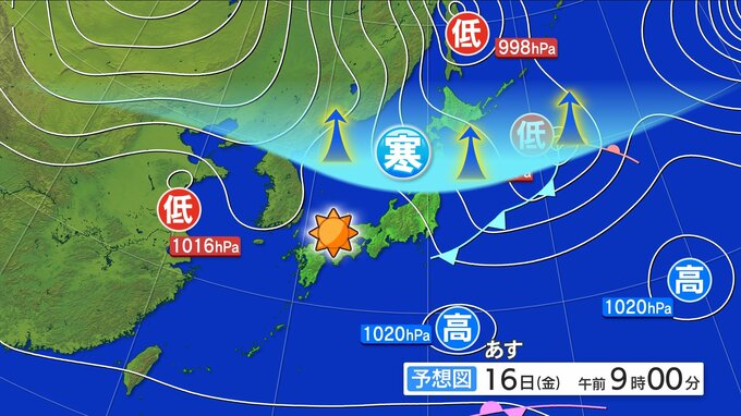 あすは天気を崩した前線は東へ進み、中国地方は高気圧に覆われてよく晴れるでしょう。上空の寒気は北上して影響を受けにくいため、気温が各地で上がる見込みです。福山では17℃、加計では18℃の予想で、3月下旬~4月上旬並みとなる見通しです。晴れて春の陽気となりますが、黄砂の飛来が予想されます。洗濯物は室内干しの方が安心です。アレルギー体質の方は、マスクを着用するなど、対策をしてお過ごしください。