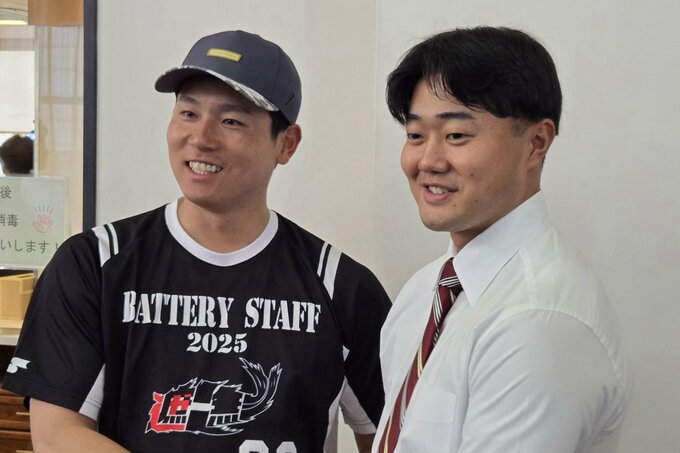 開幕守護神を狙うドラフト4位の工藤泰己投手(北海道出身)に栗林投手もエールを送っていました。