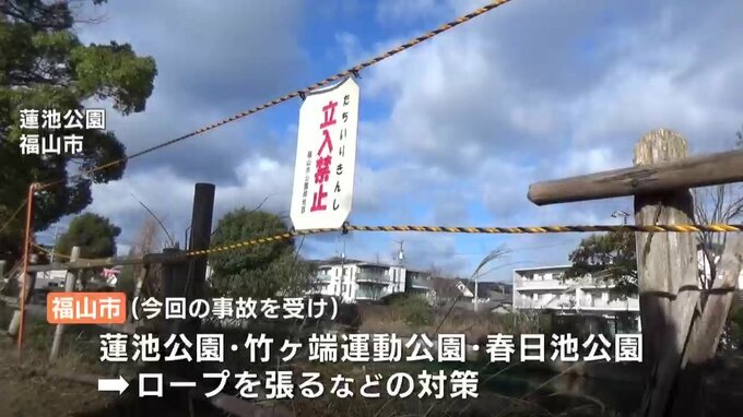 今回の事故を受け、福山市は、ほかの3つの公園の危険な場所にもロープを張るなどの対策をしました。また、来年度以降、今回、事故のあった緑町公園に面した長さおよそ220メートルあるこの水路の植え込み沿いにフェンスを設置する計画です。