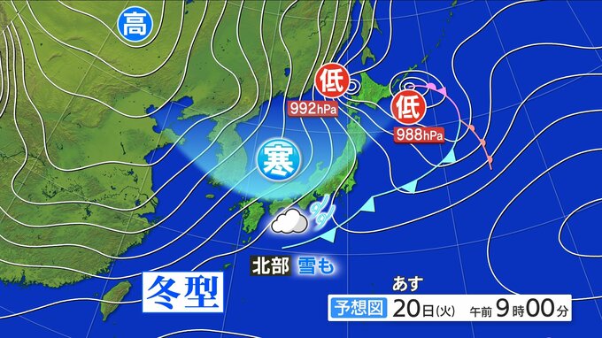 あすは次第に冬型の気圧配置に変わり、上空に強い寒気が流れ込みます。寒気の影響で雲が広がりやすく、北部では雪が降るでしょう。また、等圧線の間隔が狭くなっており、北風が冷たい一日になる見込みです。